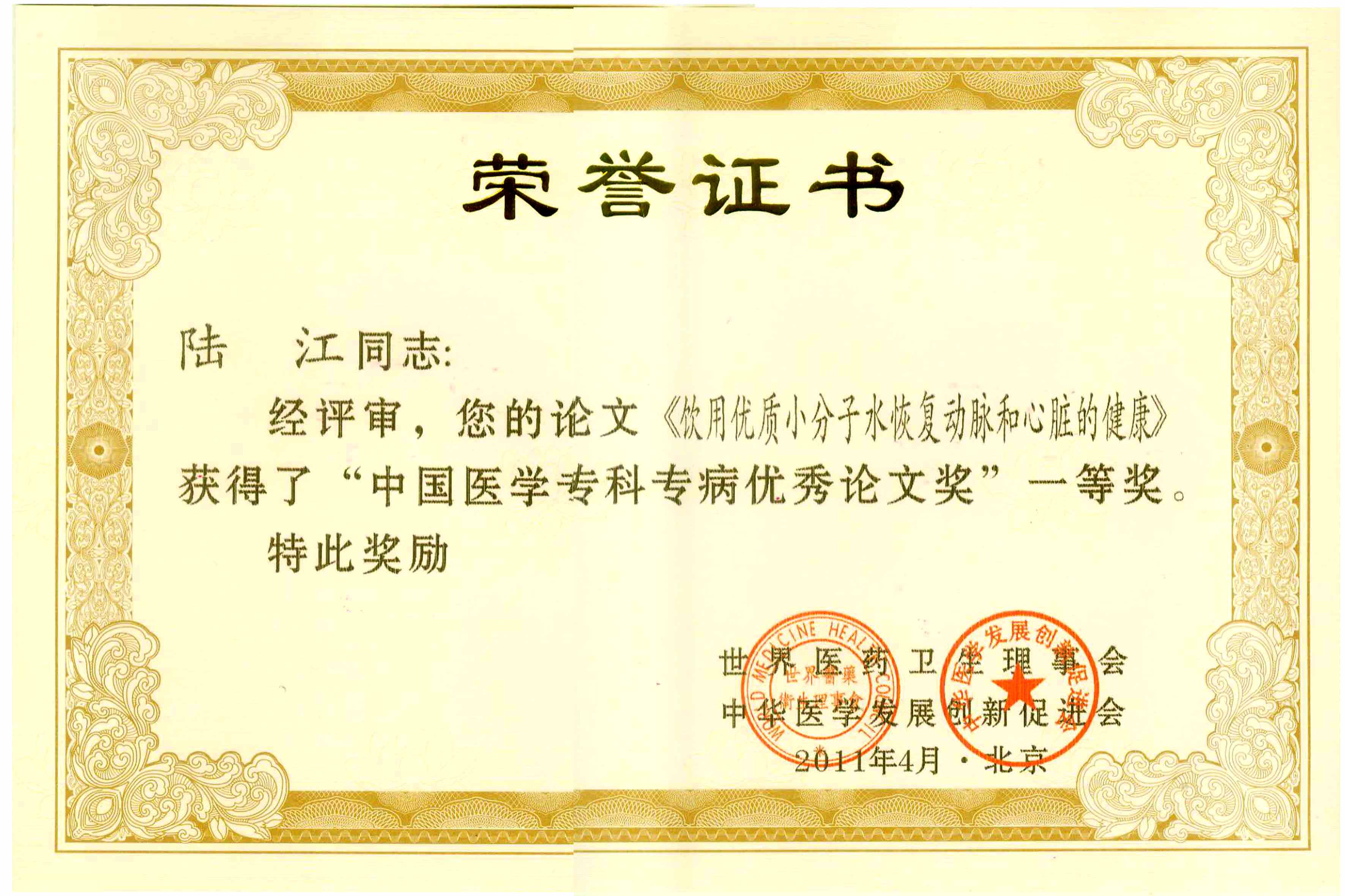 《飲用小分子水治療高血脂》獲優秀論文獎